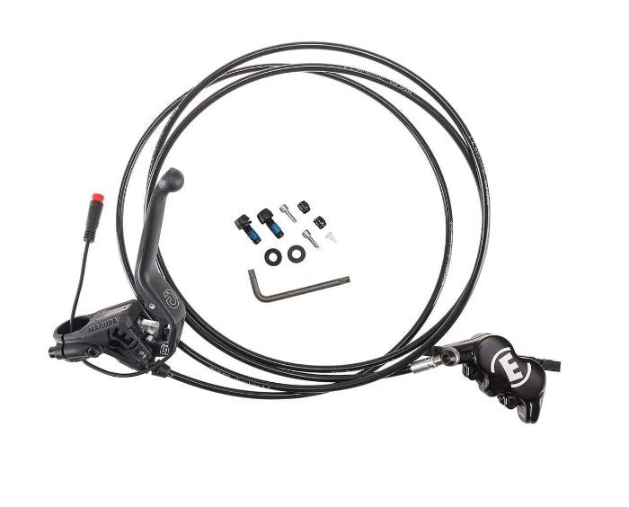 Hydraulic disc brake MAGURA MT5e is perfect 4-piston brake for electric MTB e-bikes or also for electric e-scooters. MAGURA MT5e is a updated basic entry level in 4-piston MAGURA MT brake family with HIGO-Closer cable and connector for motor disengaging during braking. MAGURA MT5e brake lever body is very light thanks to unique Carbotecture material. This brake is supplied with 3-finger aluminium lever blade with ball-end for more safety.